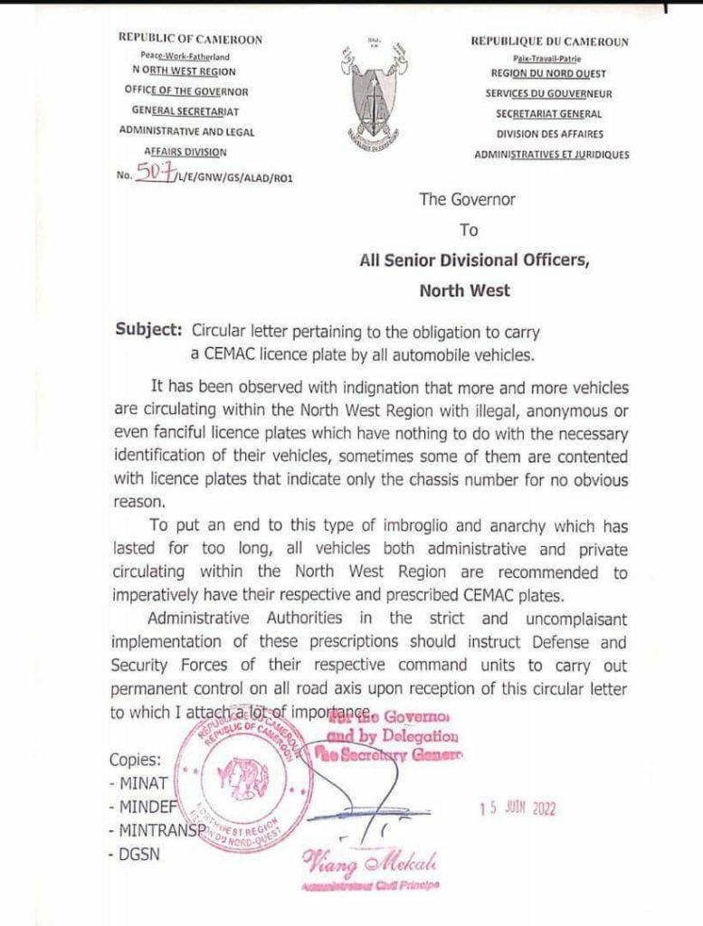 According to a circular warning drivers who respect this move, the governor said he was surprised that, ” more and more vehicles were circulating within the north west region with illegal, anonymous or even fanciful licence plates”