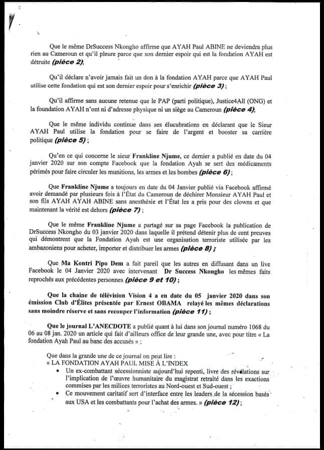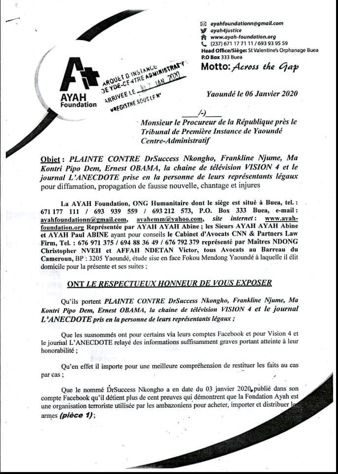 The AIF informs the public that it has this day, seized the court of first Instance Yaoundé, against DrSuccess Nkongho, Mr. Frankline Njume, Mr. Ernest Obama and Vision4 TV, ‘Ma kontri Pipo Dem’ Social Media platform and ‘le journal l’Anecdote’, for defamation, blackmail, propagation of fake news, etc.
