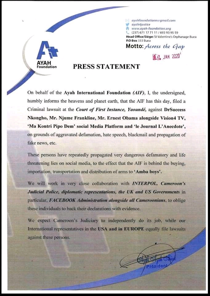 The President of the Ayah International Foundation, Ayah Ayah Abine, has closed that the Foundation has sued some persons who accused them of collaborating with Ambazonia Separatist fighters by distributing arms to them. While pursuing the same case in the US and Europe, AIF said they have dragged Dr Success Nkongho, Mr. Frankline Njume, Mr. Ernest Obama and Vision4 TV, ‘Ma Kontri Pipo Dem’ Social Media platform and ‘le journal l’Anecdote’, for defamation, blackmail, propagation of fake news, CNA has gathered.
