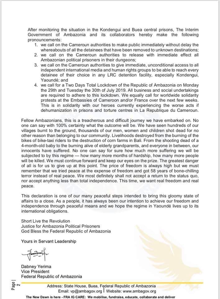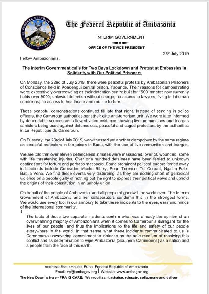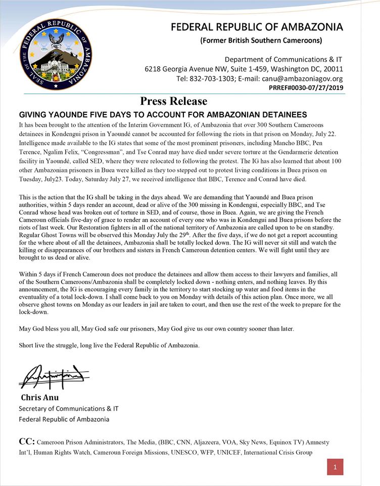 Threats of an indefinite lockdown and a lockdown on Tuesday, July 30, 2019, have been announced. The different groups fighting for the restoration of the State of former British Southern Cameroons, now prefered as “Ambazonia” have demanded the whereabouts of the prisoners blindfolded and taken from Kondengui prison to unknown destinations, without which the whole of North West and South-West regions will be shut down, press releases read.