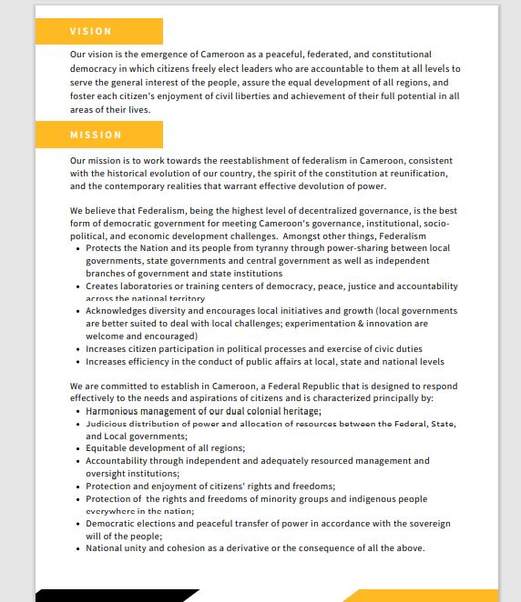 “For our ground, we have the historical and constitutional background of our country as it was formed in 1961. For our guide, we have the diversity and complexity of contemporary Cameroonian society. For our staff, we have the aspirations of citizens from the four corners of our country. And for our companion, we have the Cameroonian people.”