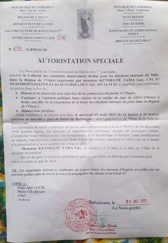 The Divisional Officer (D.O.) for Bafoussam I has signed a special authorization for some members of the Cameroon Renaissance Movement, CRM, to organize a press conference. This, is to enable the members of a sub-group called “group of candidates abusively removed from internal elections in the west region” united under Kenmegne Tama Guy, to explain to the public what the problem is within the party.