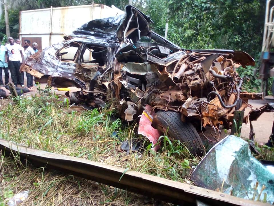 This is the result of a car accident which occured this May 8th on the Yaounde – Abong Mbang stretch at about 5PM. the vehicles involved were a black prado immatriculated CE 847 JDXXDD which was coming in from Yaounde. This vehicle in an attempt to avoid a pot hole on the road switched lanes and was head to head with a truck with number plate BG33AGK/BG34AGK whcih was traveling to Yaounde.