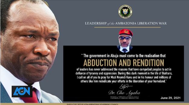 The leader of the Ambazonia Governing Council, Dr. Ayaba Cho Lucas, said IPOB confirmed the arrest of their leader Nnamdi Kanu and extradited him to Nigeria. Ayaba Cho whose group AGovC recently signed a collaborative partnership with the Indigenous People of Biafra, IPOB, described the extradition as “abduction” and reminded the Nigerian government that “Abduction and rendition of leaders has never addressed the reasons that have compelled people to act in defiance of tyranny and oppression”