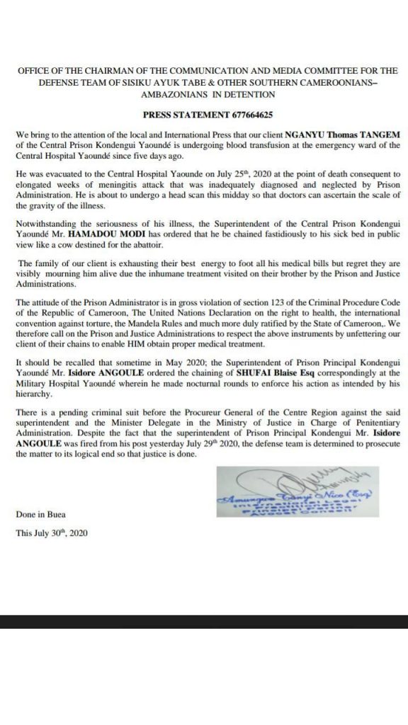 Pictures of him in chains at the Military hospital in Yaounde exposed a man dying in chains and pains without trial.