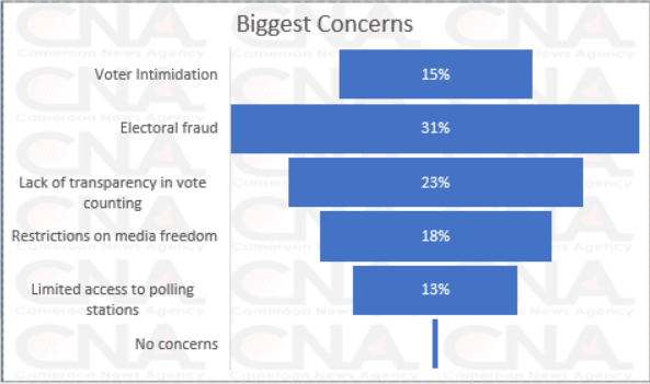 Fear of electoral fraud featured as the most prominent issue among respondents, with 31% indicating that they feared some kind of fraud from the system. The second most prominent issue was lack of transparency in vote counting, with 23% of respondents, followed by lack of media freedom at 18%, then voter intimidation at 15% and limited access to polling stations with 13%. There were zero responses as to whether anyone had no concerns at all.