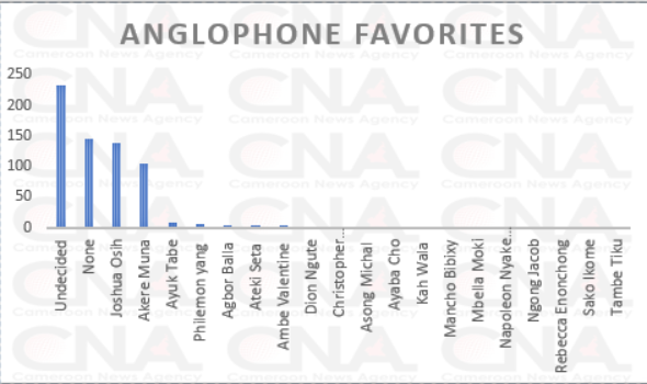 A list of Anglophone leaders was provided, and only those who had applied to be candidates; however, some respondents added their own choices, and the list was therefore extended. The number next to each name indicates the number of respondents who favored that candidate as an Anglophone leader.