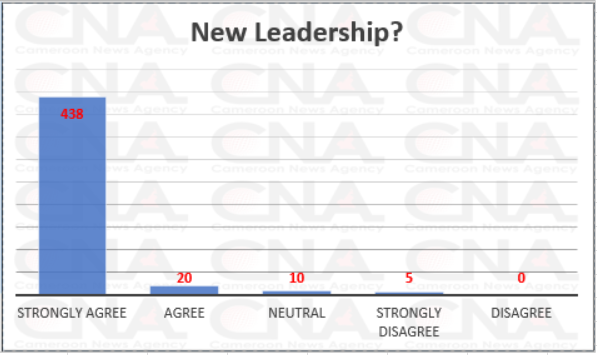 Another crucial question for respondents was whether they favored a new president, other than Paul Biya,  in the country. 438 strongly agreed that they wanted new leadership in Cameroon; 20 agreed; 10 were neutral; 5 strongly disagreed, while 0 disagreed.