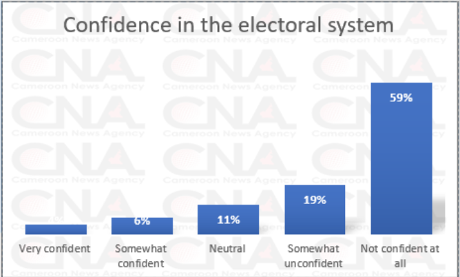 A majority of respondents expressed a lack of confidence in the electoral system in Cameroon. This was corroborated by the numbers, as 59% (280 respondents) indicated that they had no confidence in the electoral system at all. Another 92 respondents (19%) also indicated that they were “somewhat unconfident”. 54 other respondents (11%) said they were neutral on the matter; 30 others (6%) said they were “somewhat confident,” and just 17 (4%) said they were “very confident” in the system.