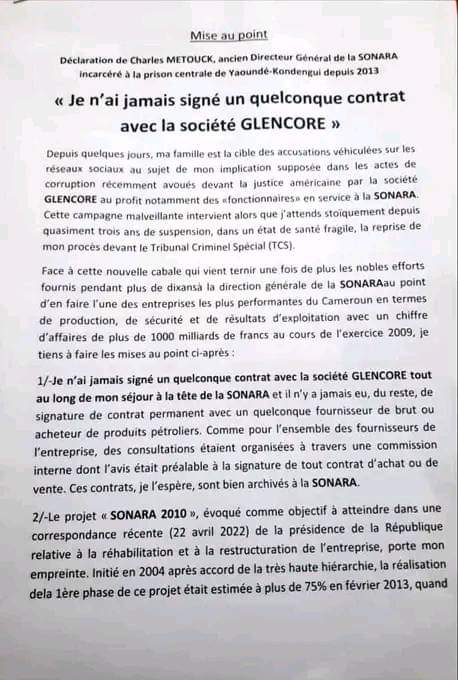 From the Yaounde main prison, Charles Metouck pens down a two page document exenorating himself from allegations of bribery.