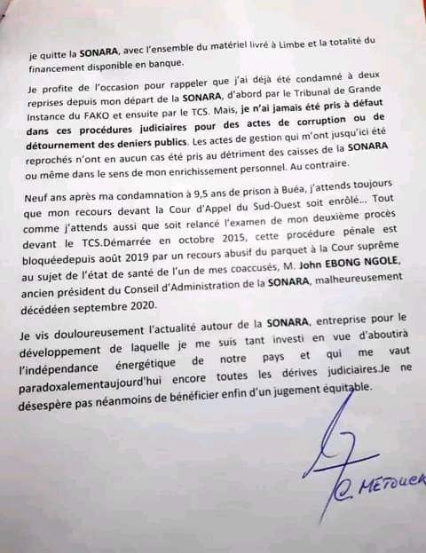 In this document, Metouck says he has never been found wanting in corruption and bribery both by Fako High Court and in Yaounde.