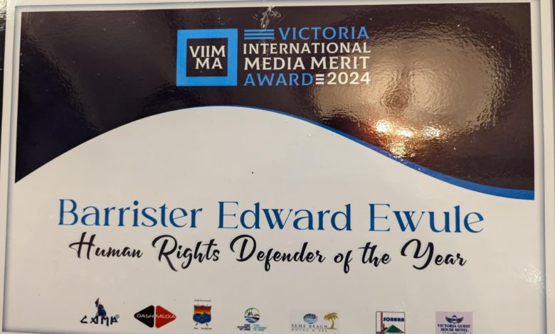 In a resounding recognition of his unwavering commitment to justice, Barrister Edward Lyonga Ewule has been named Human Rights Lawyer of the Year by the Victoria International Media Merits Award (VIMMA). The prestigious award was presented during a grand ceremony on Friday, August 16, at a hotel in Douala.