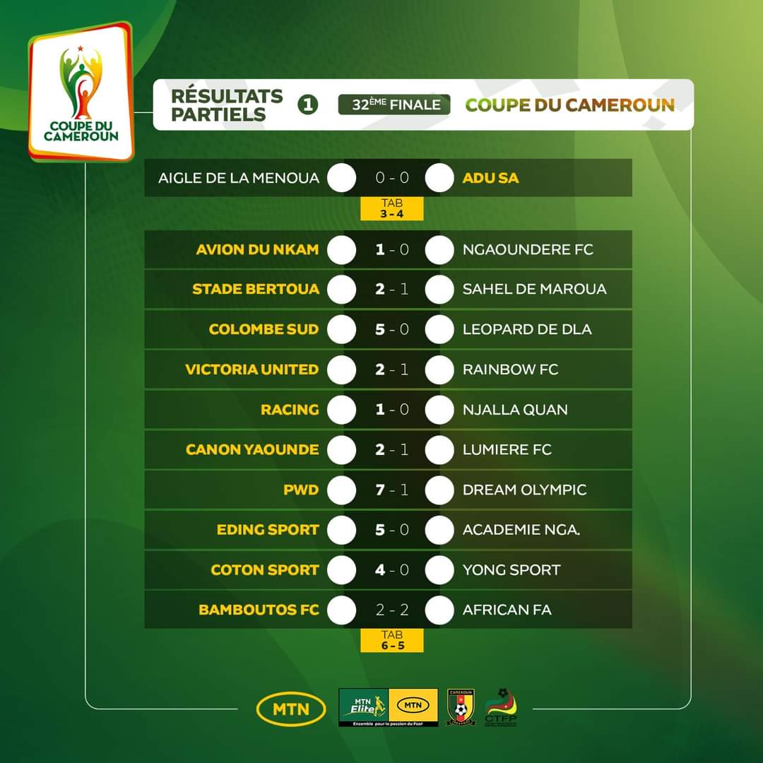Another major upset in this 32nd finals was the Elimination of Dragon of Yaoundé by a Stade of Bandjoun, a team from the West Regional League. The team thrashed Dragon 4-0 to book her place in the 16th finals where she will face Bamboutos FC of Mbouda in a West Regional clash.