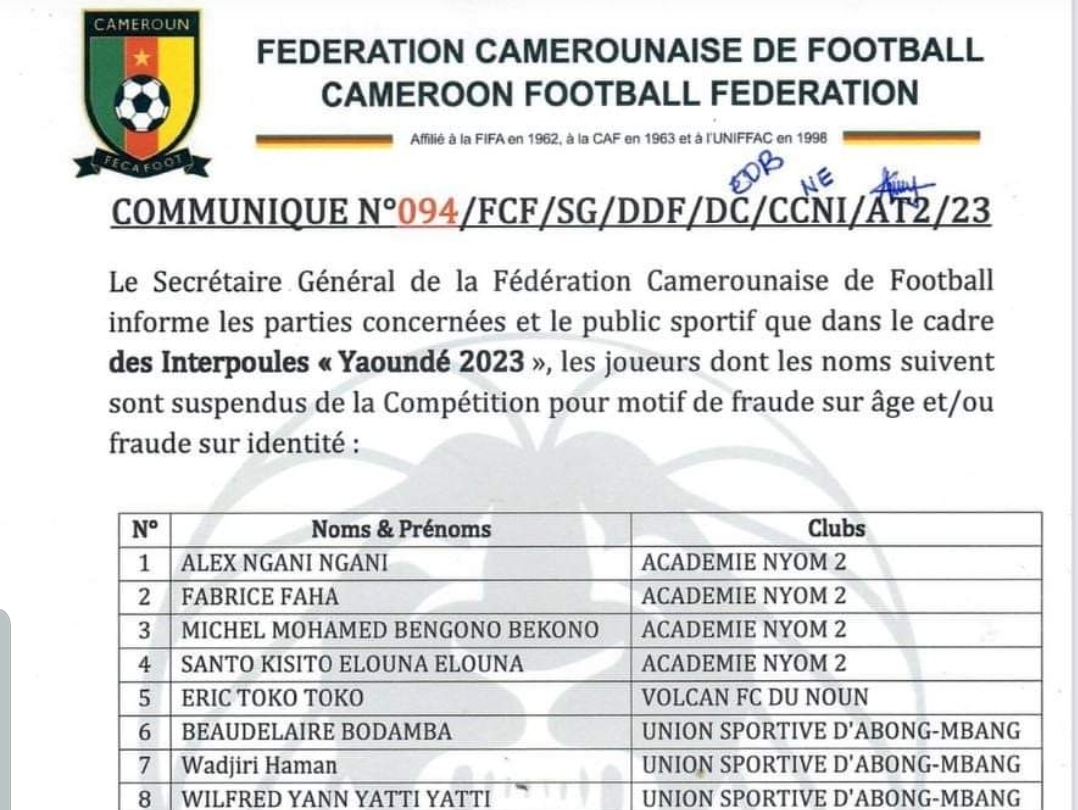 The 8 players taking part in the 2023 Interpools were suspended by the Cameroon Football Federation for cheating on their ages.