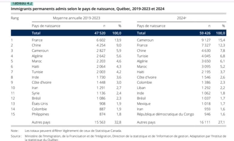 The ISQ report reveals that 9,127 Cameroonians left the country in 2024 to settle permanently in Quebec. This figure represents a 42% increase from 2023 and places Cameroon ahead of France with just 7,327 immigrants, followed by China (4,630), Tunisia ( 4,045), Algeria ( 3,650), and Morocco ( 3,095) as the leading country of origin for permanent immigrants.