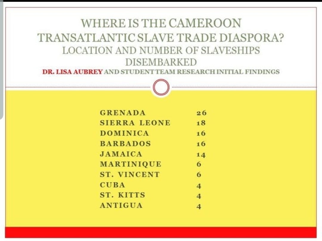 Her research reveals that a total of 114 ships left Bimbia, Cameroon with slaves to places such as Grenada, Argentina, Dominica, Jamaica, Martinique, St. Vincent, Cuba, St. Kitts and Antigua