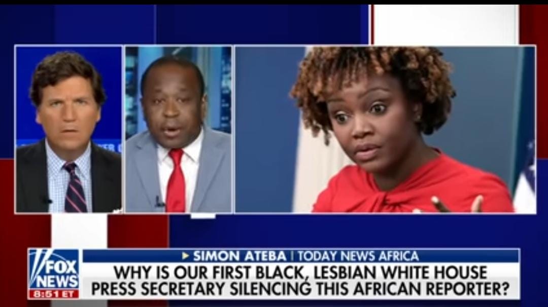 Ateba later appeared on Tucker Carlson’s show claiming that “It’s been a total catastrophe, a real nightmare covering the Biden White House…” and that he was the “voice of Africa in the US…” and that “the level of discrimination against me and against African journalists in the White House is astounding. It’s disgraceful…”.