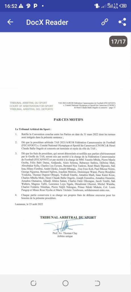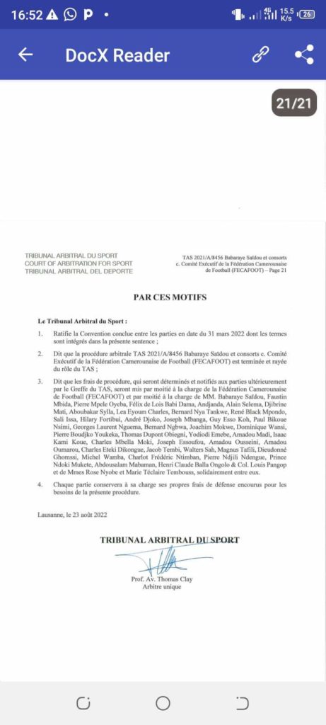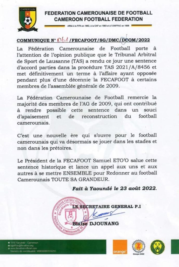 In reaction, FECAFOOT has in a release signed by its Secretary General Blaise Djounang, this Tuesday August 23rd, thanked the members of the 2009 general assembly who contributed to the verdict announced this day by CAS.