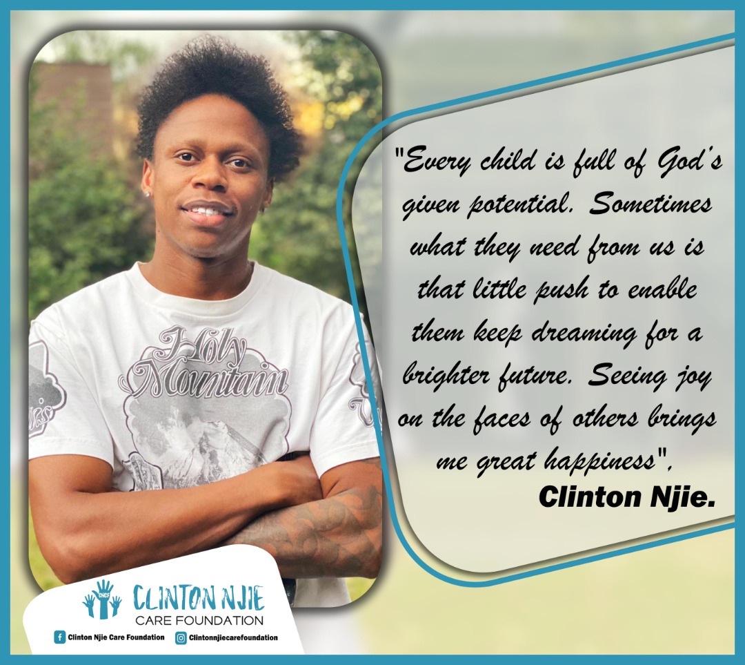 Through his foundation, the Clinton Njie Care Foundation (CNCF), Clinton hopes to touch as many lives as possible. The objective of the foundation is to support less privileged persons in society, most especially vulnerable children who can not afford basic needs to pursue their education due to a lack of finances.