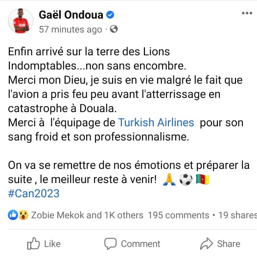 Indomitable lion Gael Ondoa has taken to his official Facebook page this May 27 to thank God for a safe landing despite a near plane crash with Turkish airlines.