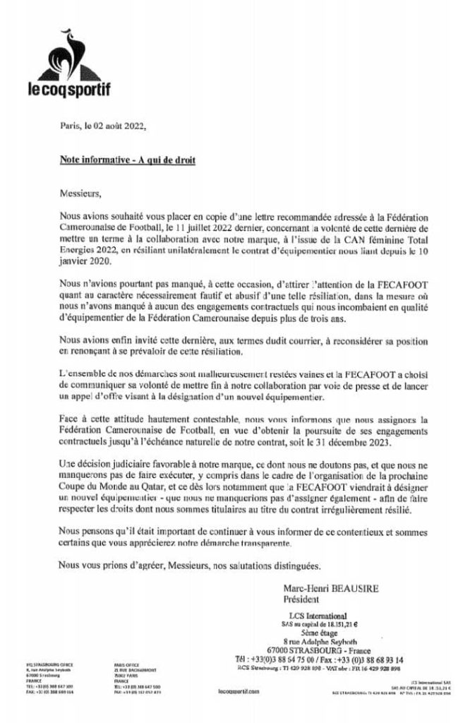 In the correspondence dated August 2nd, the company explains that the Cameroon Football Federation, FECAFOOT, unilaterally, suddenly and in all illegality, decided to put an end to their contract for reasons best known to them. They equally explain that they have made many futile attempts to put an end to what they considered a misunderstanding.