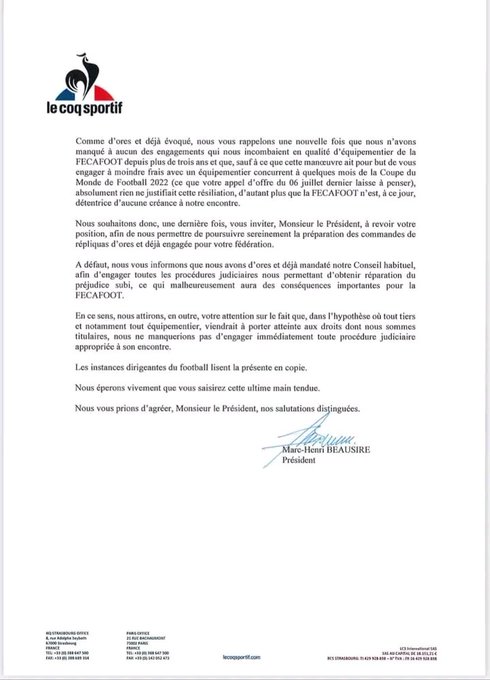 In this letter, the kit supplier says they have in no way failed to respect the terms of their contract and are currently preparing new kits for the indomitbale lions ahead of the FIFA world cup. Le Coq Sportif adds that they will be filing a complaint in court against FECAFOOT if they do not cease all negotiations with a new supplier. They further threaten to sue any equipment supplier who will agree to work with the federation.