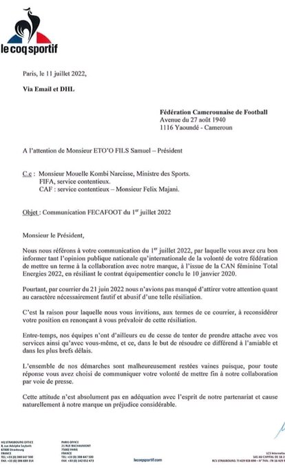Le Coq Sportif has sent out to a letter to the federation warning them of what is coming their way. In it, they say that they have attempted to talk with FECAFOOT officials and even president Samuel Eto’o Fils in order to solve the issue amicably but have been met with stiff resistance.