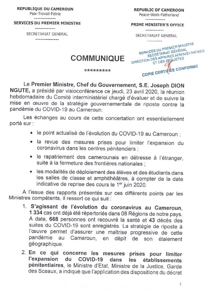 The weekly Thursday meeting usually held at the Prime Ministers office took place through a Visio Conference with the main actors involved in the fight against COVID-19 answering present. It was revealed that Cameroon now records a total of 1334 cases have been confirmed in Cameroon with 668 recoveries and 43 deaths.