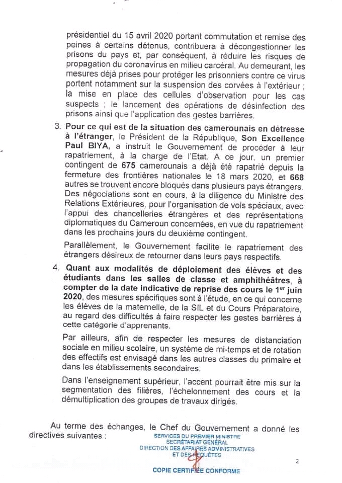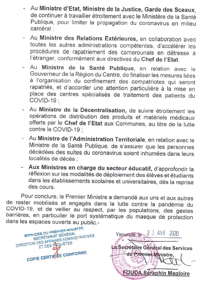 The Ministers concernred gave updates on how the measures are being executed in their areas of command beginning with Justice Minister, Laurent Esso who said the Presidential decree on April 15 to remit and commute prisoners sentences is being respected with many inmates already freed.