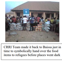 The CRRI decided to send a team of volunteers to five (5) locations in Taraba State for the purpose of food distribution to the refugees including Takum in TAKUM Local Government Area, Mubi-Tosso, Baissa, and Abong, all three in KURMI Local Government Area, and Gembu in SARDAUNA Local Government Area.