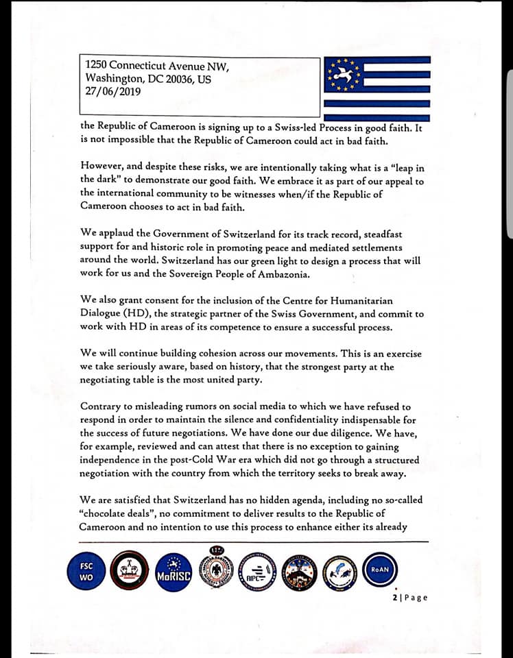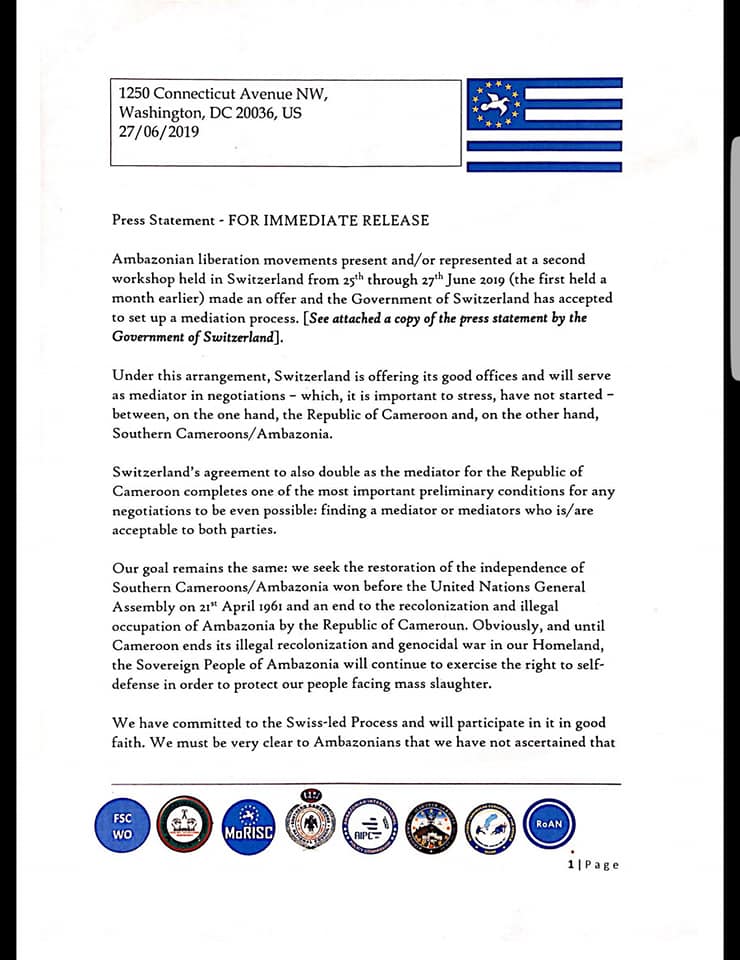 Ambazonia leaders have said as a matter of “Good Faith”, they will take part in the Swiss-led negotiation process to end the conflict in Southern Cameroons and restore her independence. In a 4 page documents released on Friday 1 AM Geneva time, they said the Cameroon Government should also show “Good Faith” to see the total independence of Southern Cameroons. The leaders also recognized the Centre for humanitarian dialogue, HD as Switzerland’s strategic partner in the process.