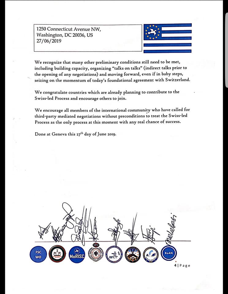 The leaders who met in Canton Valais, Switzerland for a second capacity building workshop from June 25-27, 2019, called on the international community to support the Swiss-led talks.