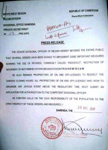 Bamenda, Cameroon-Thursday December 21, 2017-9: 20 AM Local Time (Cameroon News Agency) The Senior Divisional Officer for Mezam in the North West region has issued another order restricting movements in the night before during and after the festive period.
