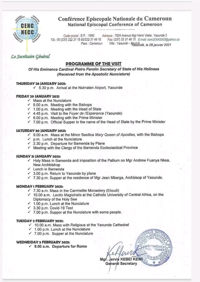 This Friday January 29, 2021, there will a mass at the Nunciature in Yaounde. He will later have a meeting with Bishops, President Paul Biya, visit to the Foyer de Esperance, meeting with Prime Minister where he will have official supper in the name of the Head of State by Prime Minister.