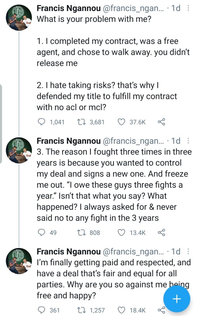 The former UFC heavyweight champion, Francis Nganou in a series of tweets, asked Dana White to leave him alone because he completed his contract and was never released as claimed.