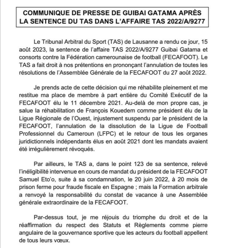 Guibai Gatama who was dismissed from the executive committee of Cameroon Football Federation, FECAFOOT has celebrated the decision of the Court of Arbitration for Sports (CAS) rendered on Tuesday 15th August 2023 against FECAFOOT and favouring their claims by pronouncing the cancellation of all resolutions of the FECAFOOT General Assembly of August 27th 2022.