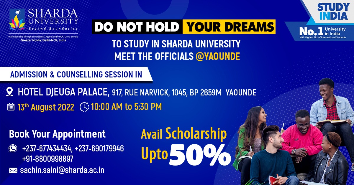 The opportunity to study at Sharda University is open for applicants from suitable qualified Cameroonians to pursue Undergraduate, Postgraduate & Research Studies at Sharda University, Delhi-NCR, India.