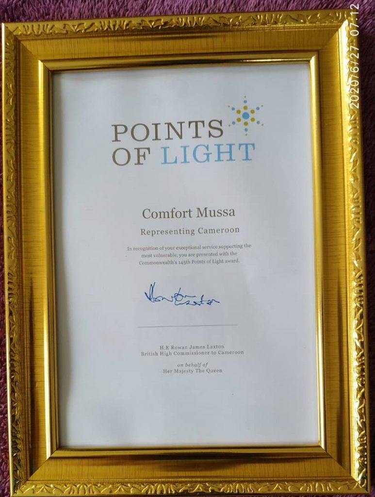 “My hearty congratulations to Comfort Mussa on winning this year’s prestigious Commonwealth Points of Light award in Cameroon. Her unstinting support for women’s rights, social justice and public health is making a huge difference to the lives of some of the most disadvantaged people here. Her work is a shining example of the impact that dedicated and skilled volunteers can make to brighten people’s lives.’