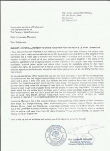 Bamenda, Cameroon-Tuesday April 3, 2018-8:30 PM Local Time (Cameroon News Agency) The SDF member of Parliament for Jakiri special constituency in Bui division North West region of Cameroon, Hon. WIRBA Joseph has urged representatives of the people in the 13 divisions that make up the two regions, to resign from Parliament and stand behind the people in ongoing Anglophone crisis.