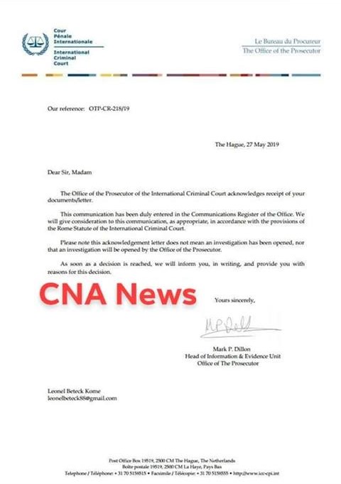 DOUALA, Cameroon- Tuesday May 28, 2019- 11:20 AM Local Time(Cameroon News Agency) The Office of the ICC Prosecutor has acknowledged that a complaint has been filed for the ICC to investigate cases of crimes against humanity, war crimes by the Biya regime, CNA had gathered.