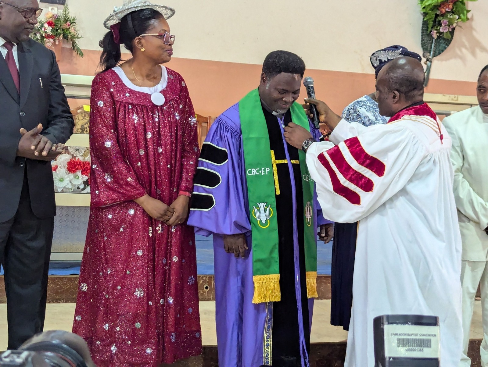 Removing the green stole (the official CBC color) inscribed with the words ‘CBC EP’ which symbolizes the office of Executive President – Nditemeh hung the green stole over the shoulders of Teke. After prayers by a college of CBC pastors, this moment signified the official transfer of power from Nditemeh to Teke.