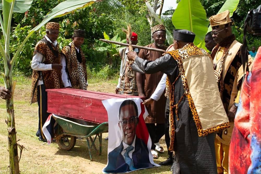 Pictures of the celebration were shared on social media, they are seen holding a wooden coffin, painted in red with the picture of the leader of the Cameroon Rennaisance Movement on the coffin.