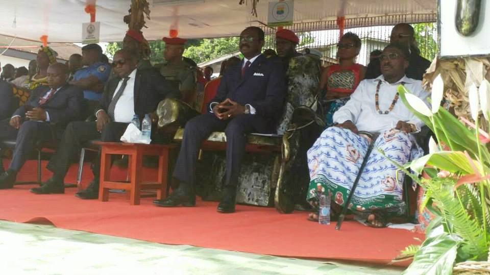 Picture One-Minister Narcisse Mouelle Kombi, laying Foundation Stone-Picture Two-Government Delegate in White attire talking to Narcisse Mouelle Kombi as South West Governor, Okalia Bilai looks on the monument site.