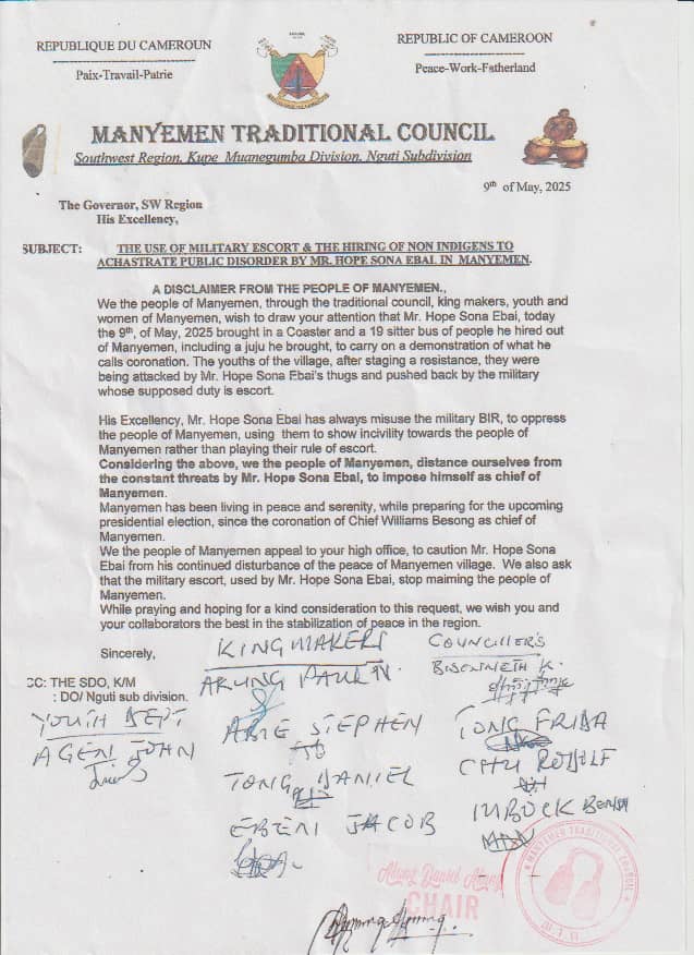 Members of the Manyemen Traditional Council, made up of youth leaders, king makers, elders, and councillors, petitioned the governor of the South West region, Bernard Okalia Bilai, calling on him to act fast and stop a self-imposed chief from causing further damage to the population.