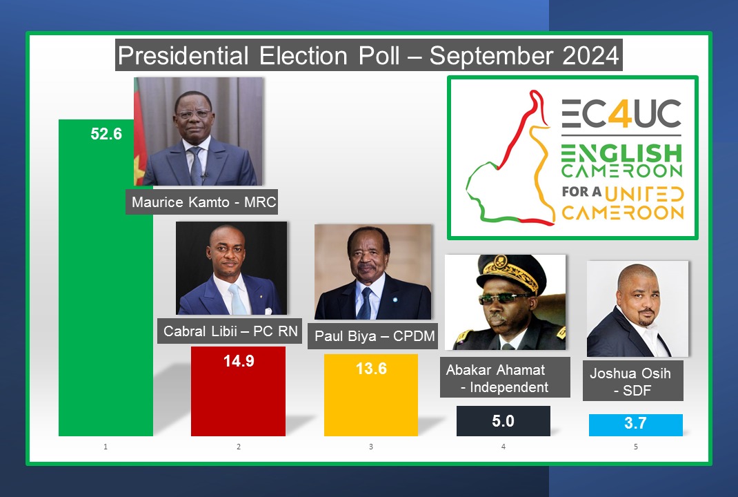 In the September 2024 poll which consisted of 846 participants, “We find that if that election were held today, and if Mr. Paul Biya were the CPDM presidential candidate, Mr. Maurice Kamto of the opposition would win such an election with about 52.6%. Mr. Paul Biya would be in the third position with 13.6%, behind Mr. Cabral Libii whose support stands at 14.9%. The relative performance of these top three candidates is not much different from that found in our opinion poll of June 2024.” the platform revealed in a report released on September 20, 2024.