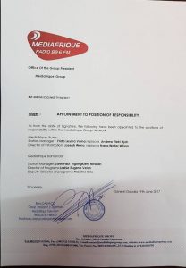 At Mediafrique North west regional station based in Bamenda, former Journalism and Mass Communication student Lohshie Eugene was appointed as new Director of Programs with Maurine Shei appointed as his Deputy.