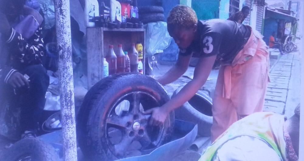Nkengni Fidele is a 35-year-old Cameroonian, a wife and a mother of 4 who has chosen the tyre repair business as a source of livelihood. She lives in Douala and works alongside her husband who is also in the business and owns a mechanic workshop.