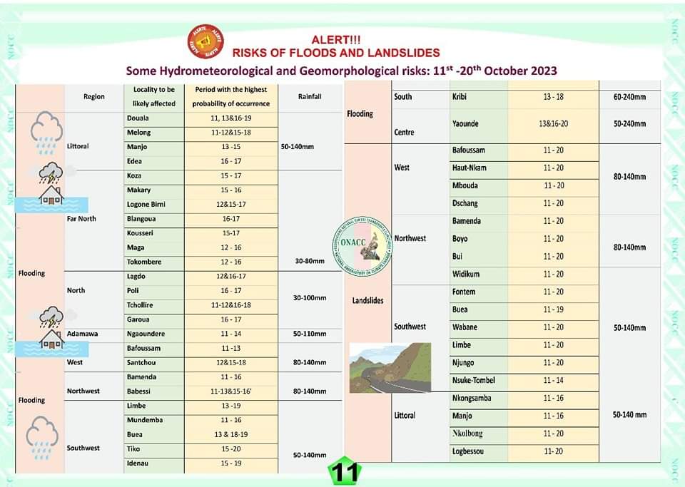 The National Meteorology Department of the ministry of Transport and the National Observatory on Climate change say some parts of the West and North West Regions might witness landslides and floods in the second half of October, 2023 due to heavy rains that will go above 130mm.