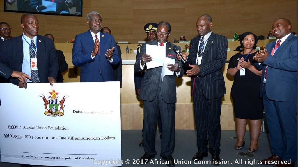 Zimbabwean president, Robert Mugabe, on Monday handed a cheque of $1 million to the African Union (A.U.) Foundation as part of efforts aimed at lessening the body’s dependence on foreign aid.
