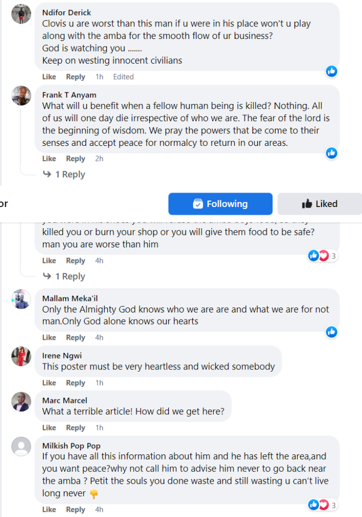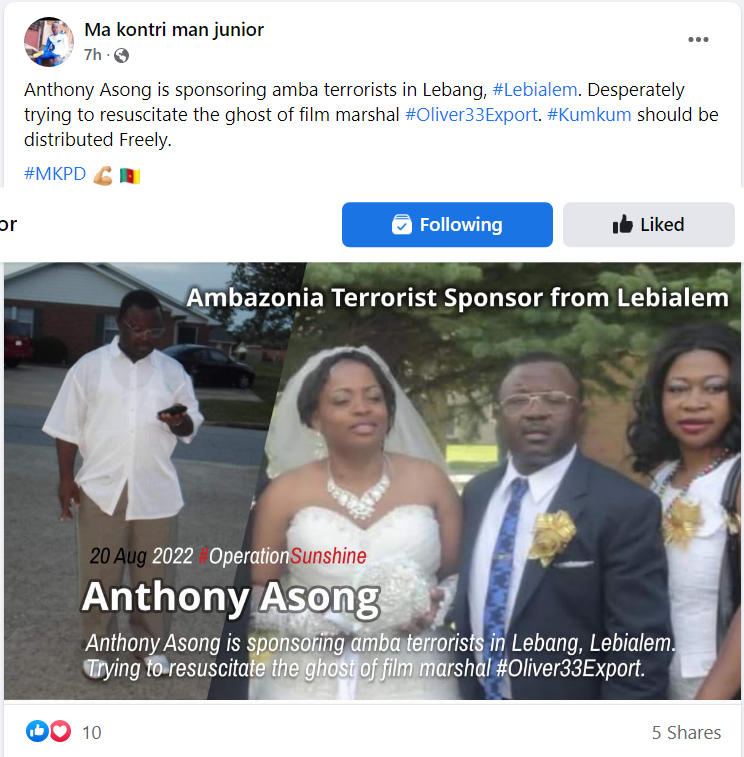 In one of the posts made by Nkonda Titus about an alleged Ambazonia fighter, he said, “So this Ambazonia terrorist called Animal for married at Kumba 2 Council. I know this because of the Mayor, He is Section President of CPDM. Mayor of Kumba II Sub divisional Council. Chief Mbachu Jacob Kay.The Mayor will be able to provide us with all the details, his real name, wife’s name, parents, address etc.. We blacklegs need to visit them all. Anyone standing in the way of us getting our justice, we will “kumkumise” them too.